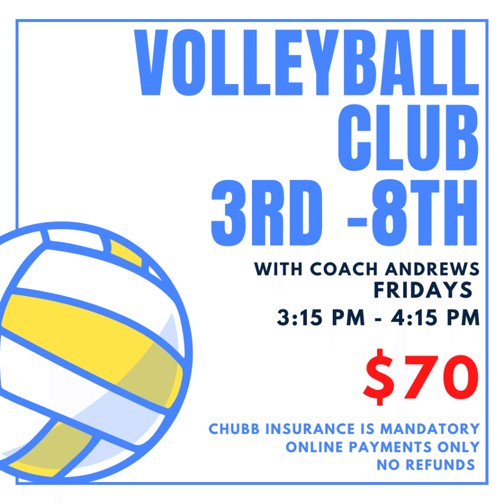 Volleyball Club with Coach Andrews on Fridays from 3:15-4:15pm https://www.bridgepay.io/bp_store.aspx?menuItem=131&menuOrder=2&subId=1668&uuid=AF4A8F5F-2165-4695-94A7-5FCD1403AD2F