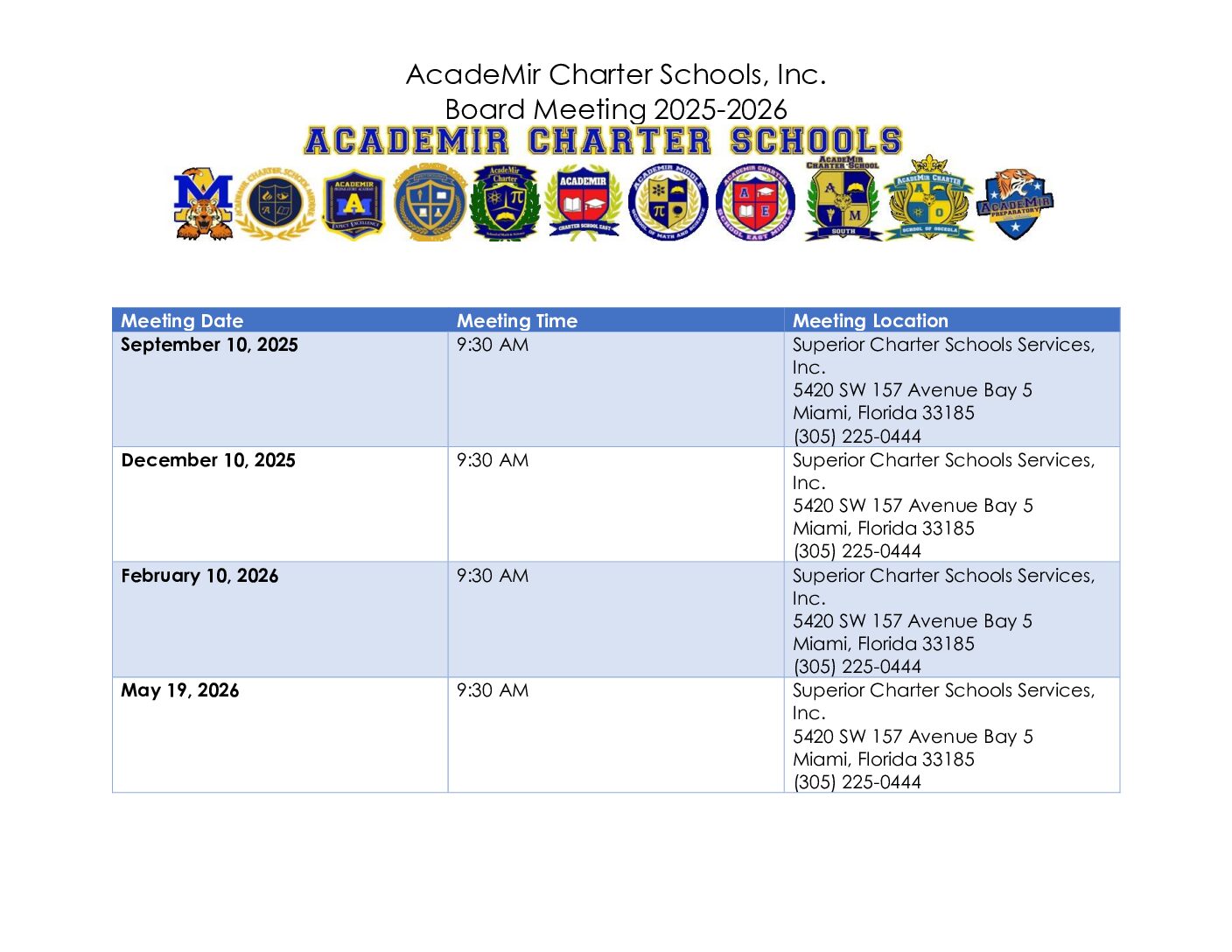 The AcadeMir Charter Schools, Inc. Board of Directors is comprised of the