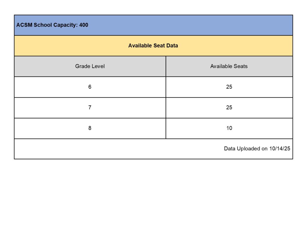 Below is our student capacity/seat availability, by grade level. We are required to update this information every 12 weeks, please note that the capacity number may change during the 12-week period as family members may withdraw or new families apply.